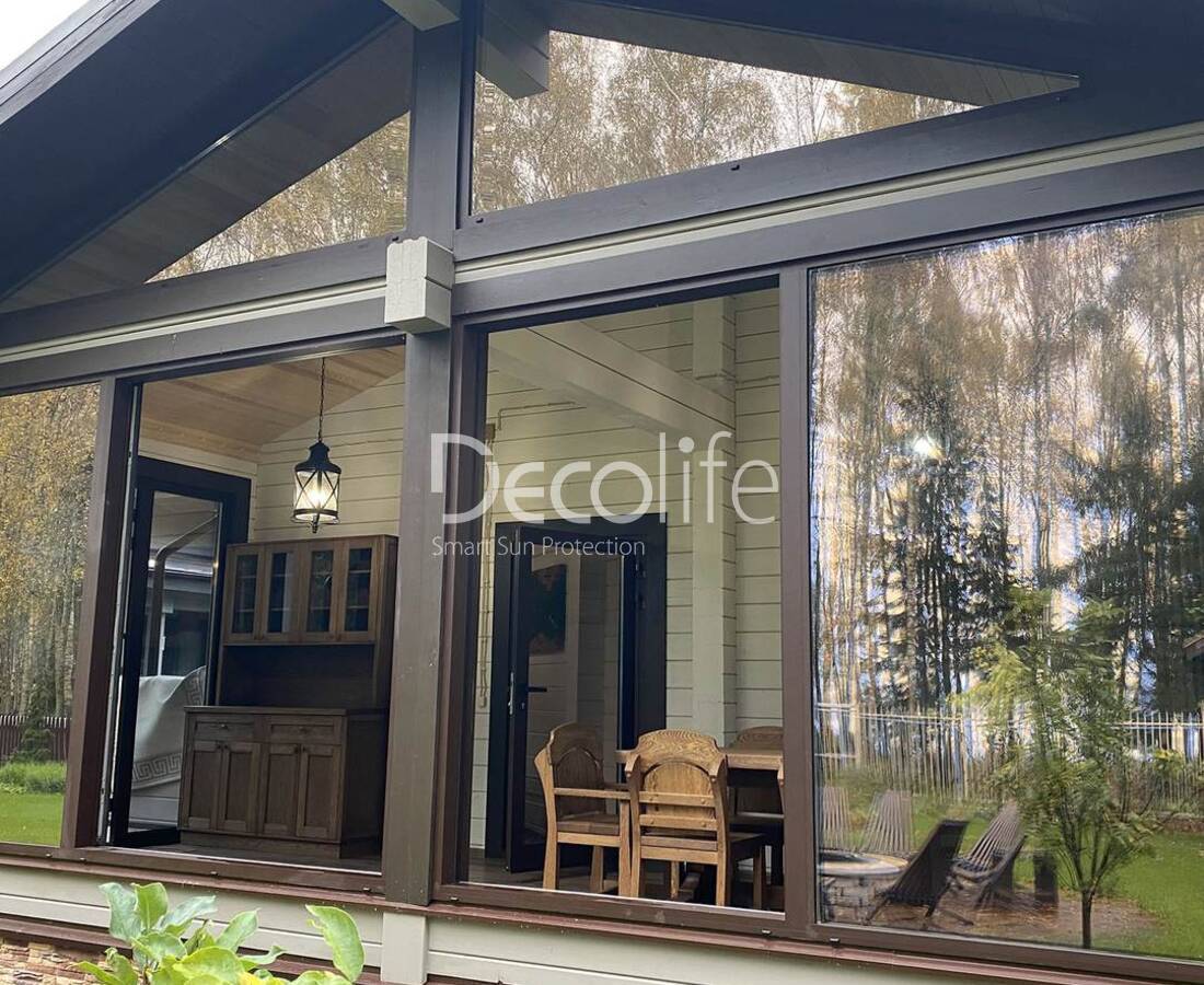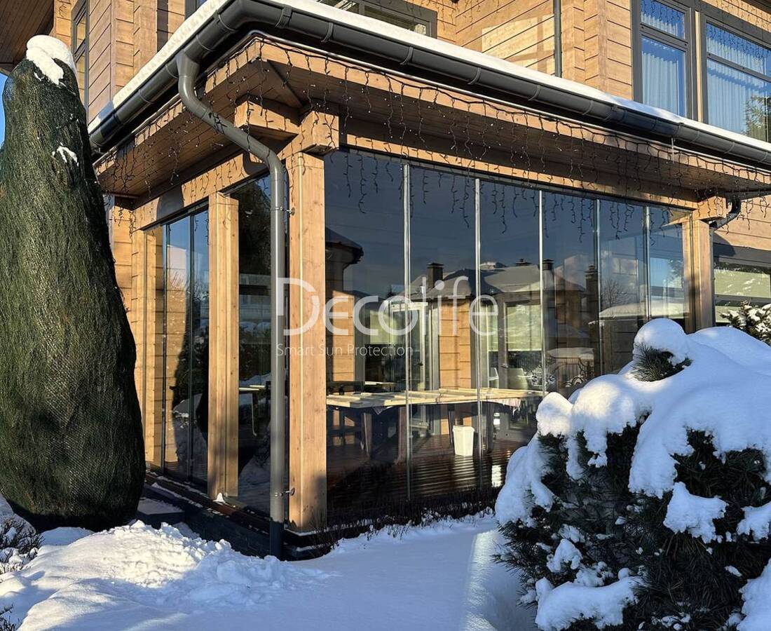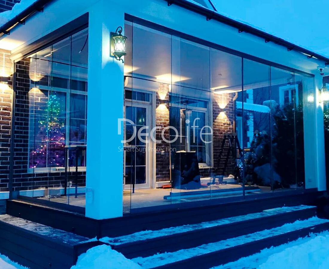 Конструкция может состоять максимум из 10 панелей, их количество подбирается с учетом характеристик и размеров террасы. Остекление помогает сохранить внутри тепло и приятную обстановку.