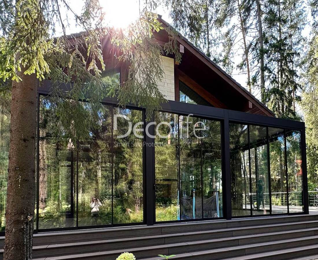Пергола Decolife Bioclimatic B500-25П + Раздвижное остекление S500, реализовано партнером "ООО Люкс Террас" - г. Москва